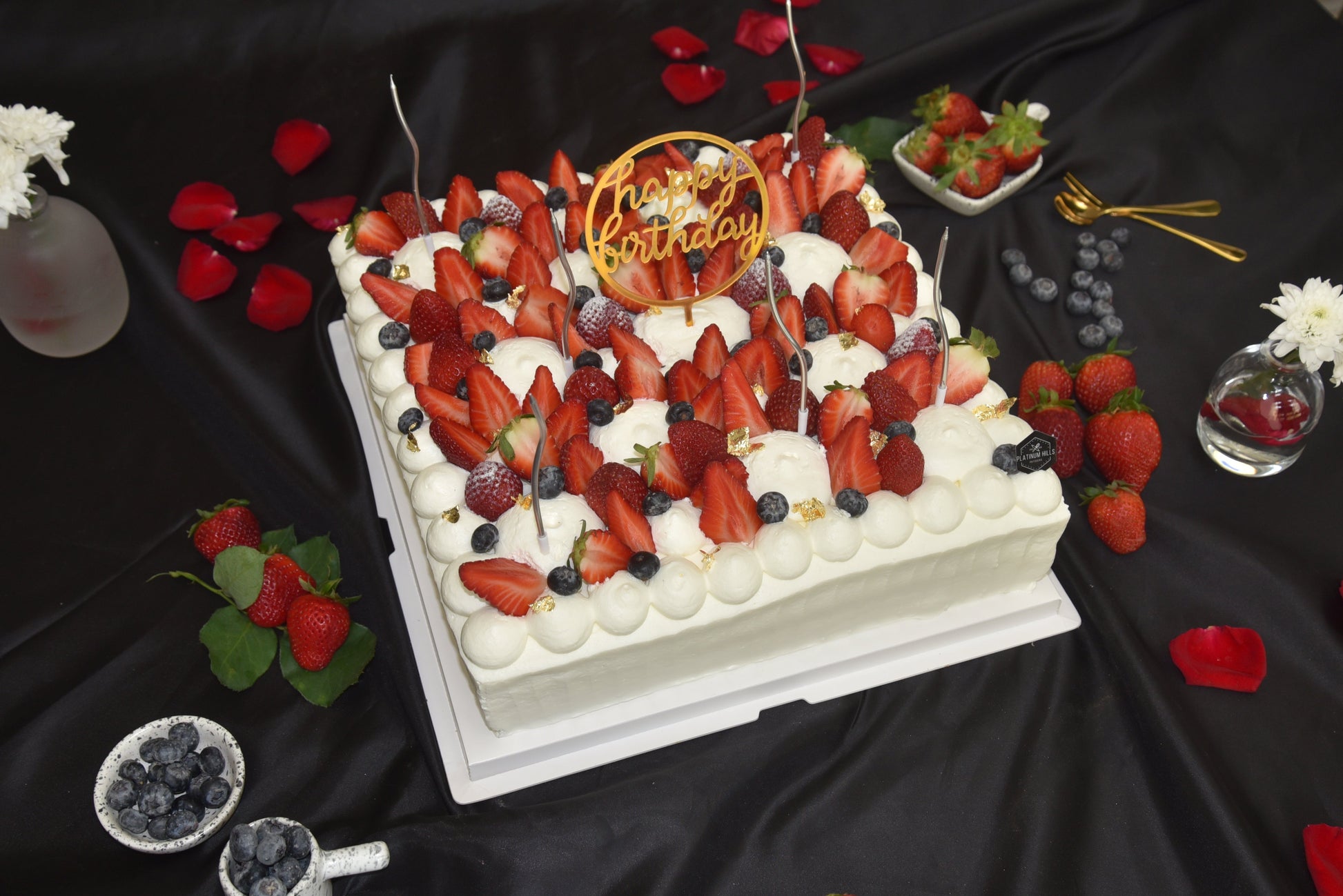 ตกแต่งด้านบนด้วย สตรอเบอรี่และบลูเบอร์รี่สดคัดพิเศษอย่างสวยงาม เพิ่มความโดดเด่นให้กับเค้ก